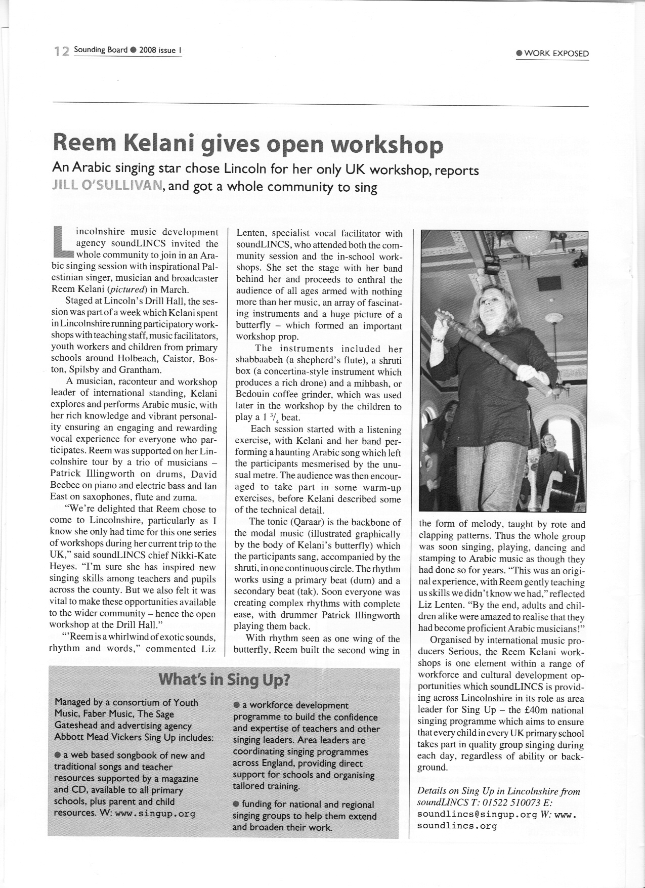 As part of the Music Manifesto's National Singing programme, Reem conducted a series of workshops on Arabic and Palestinian singing across Lincolnshire (organised by Serious in conjunction with Soundlincs), March 2008.