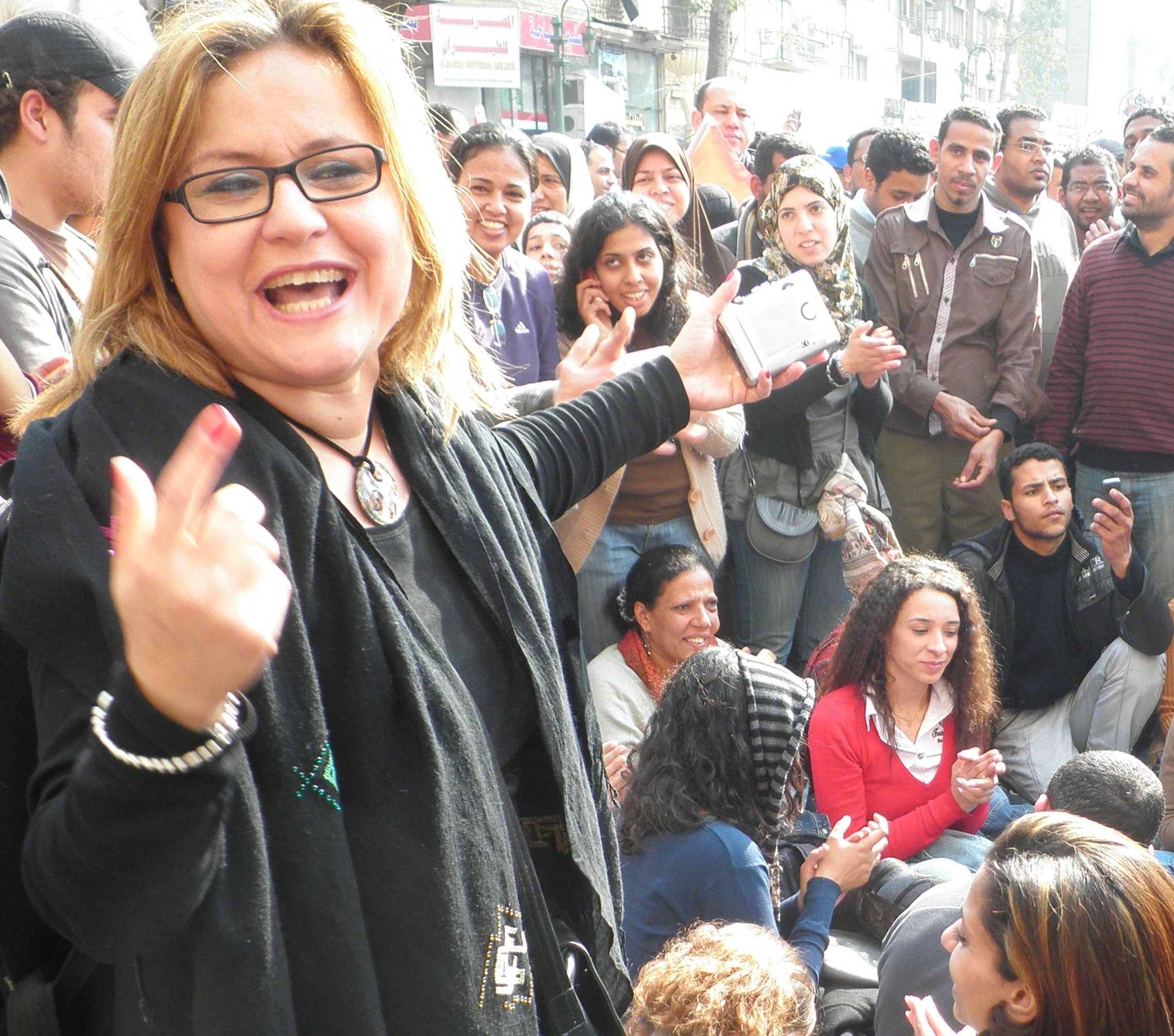 ![]() Reem recording women singing, Tahrir Square, Cairo. Photograph by Chris Somes-Charlton 1 Feb 2011 |