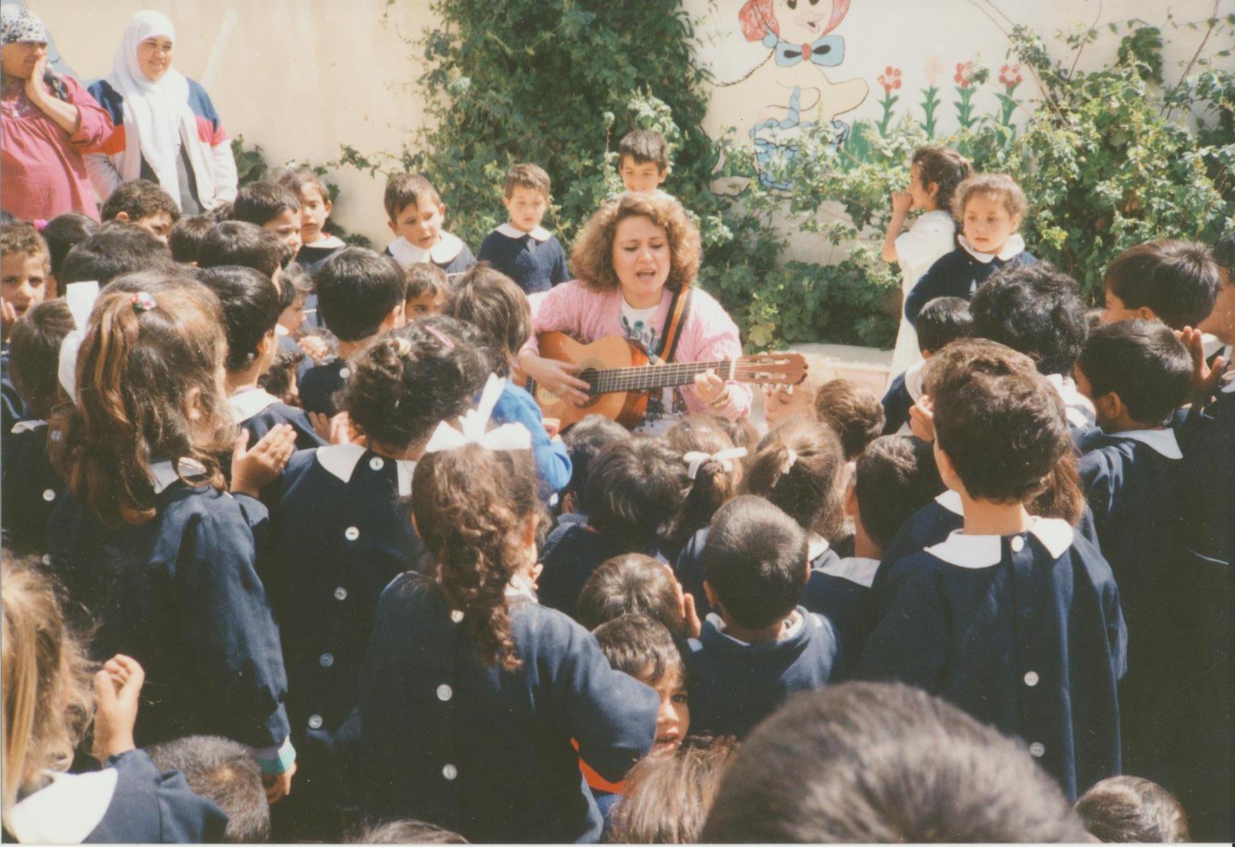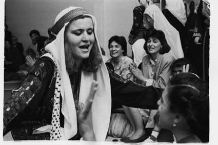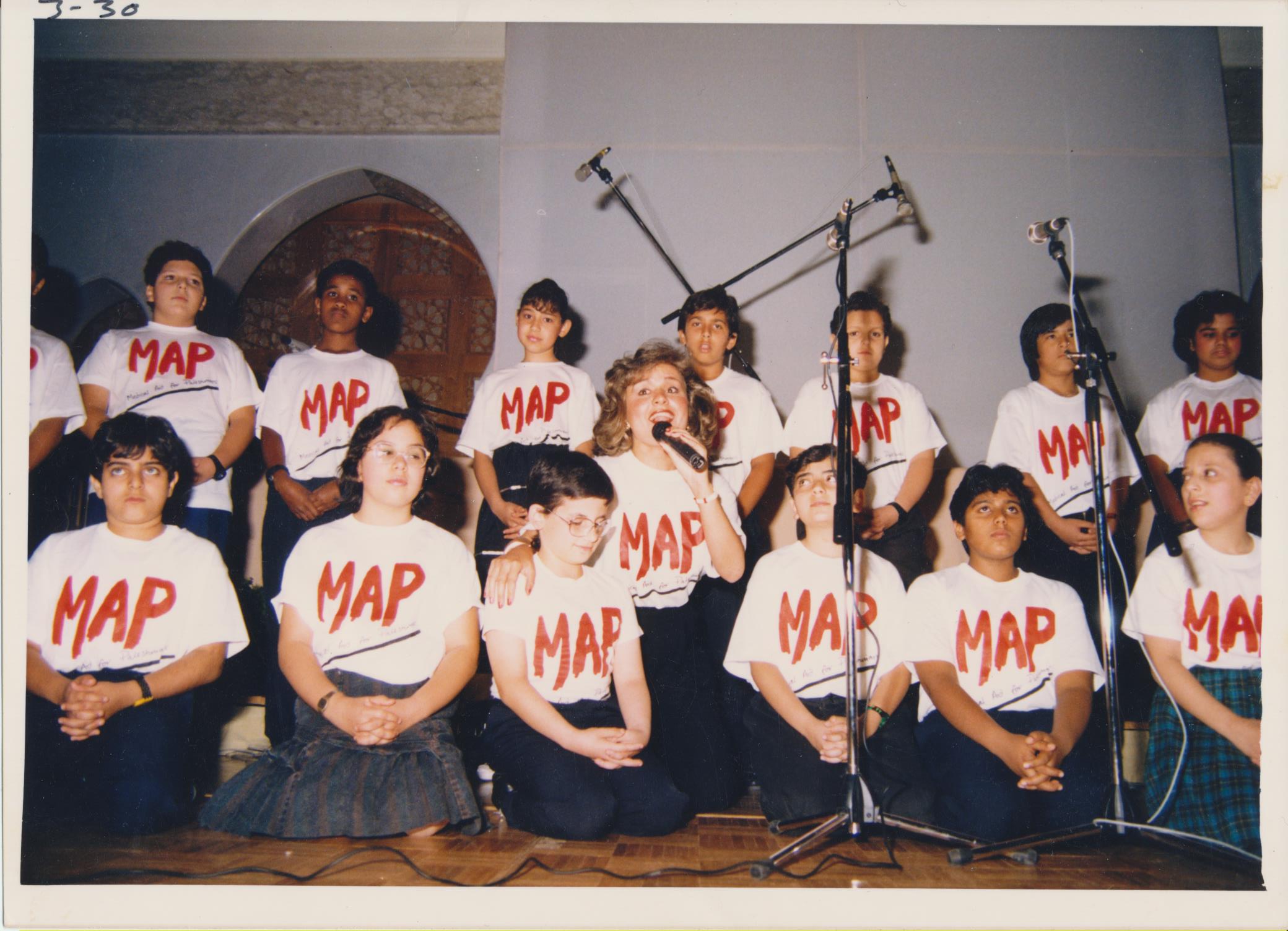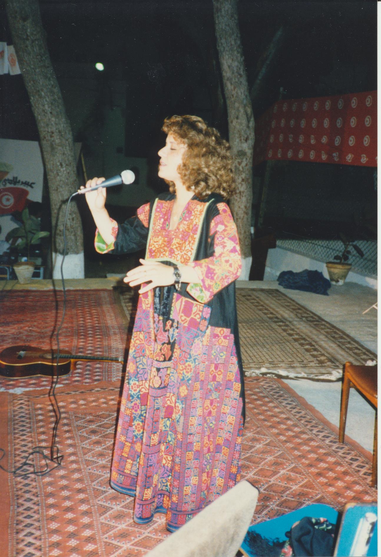 ![]() Performing at a fundraiser for Medical Aid for Palestinians (MAP) hosted by the General Union of Palestinian Women, 1989, Kuwait |