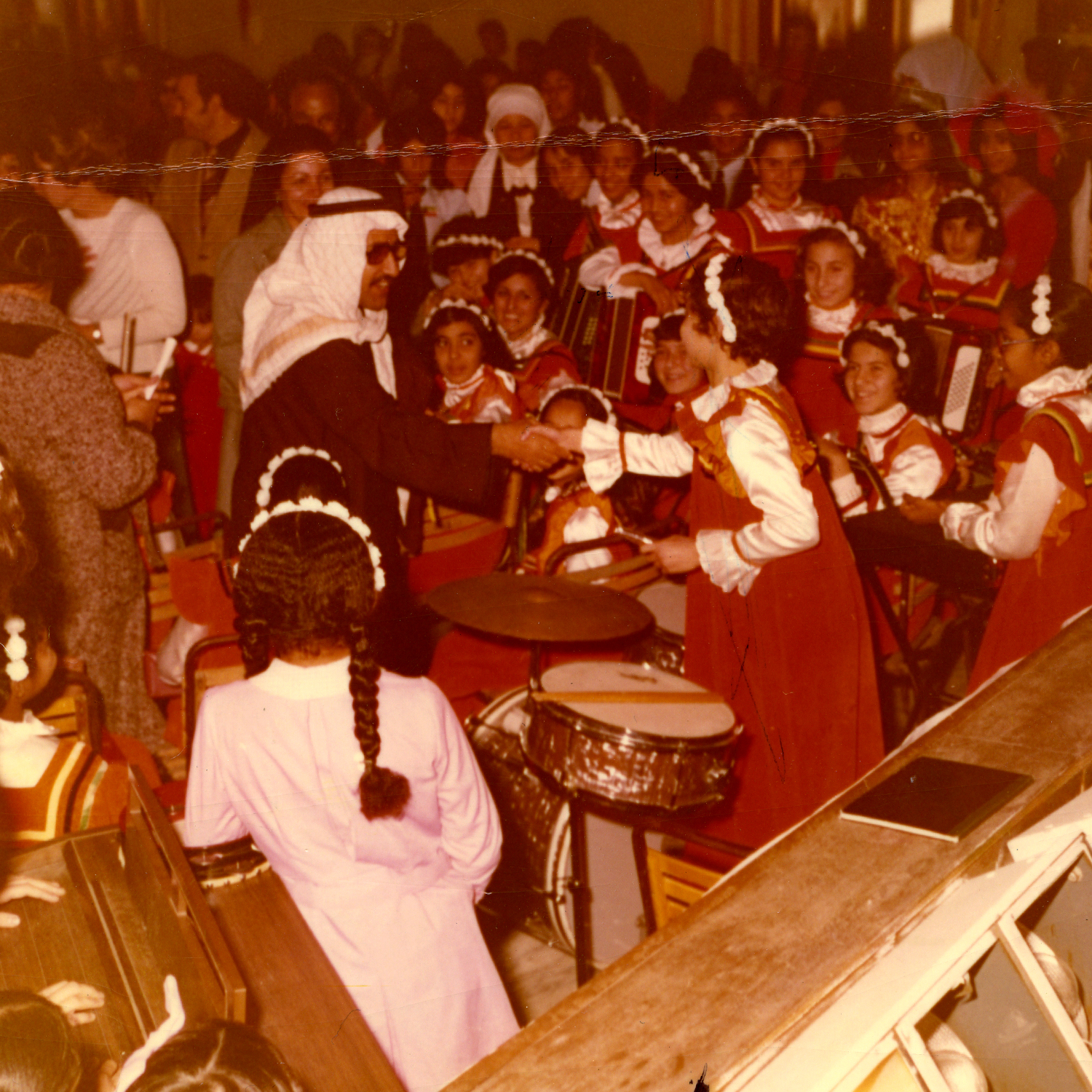 Circa 1975-6, KuwaitAs drummer of the school orchestra, Reem received an award on behalf of the orchestra at Khawla School from the great Kuwaiti musician Shadi al-Khaleej. |